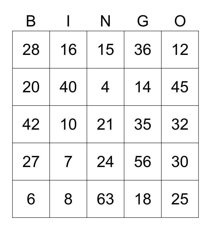 This bingo card has a free space and 24 words: 7, 8, 4, 6, 12, 28, 20, 16, 35, 24, 14, 42, 56, 30, 40, 18, 32, 15, 45, 10, 25, 27, 36 and 63.