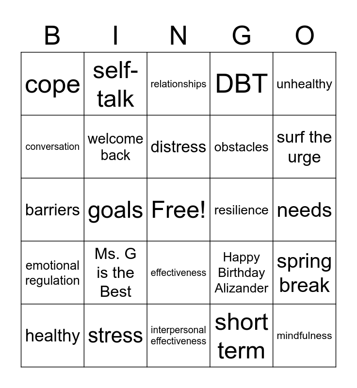 This bingo card has a free space and 24 words: Ms. G is the Best, stress, distress, healthy, unhealthy, cope, conversation, self-talk, resilience, effectiveness, obstacles, barriers, Happy Birthday Alizander, spring break, welcome back, short term, needs, relationships, surf the urge, goals, mindfulness, emotional regulation, DBT and interpersonal effectiveness.
