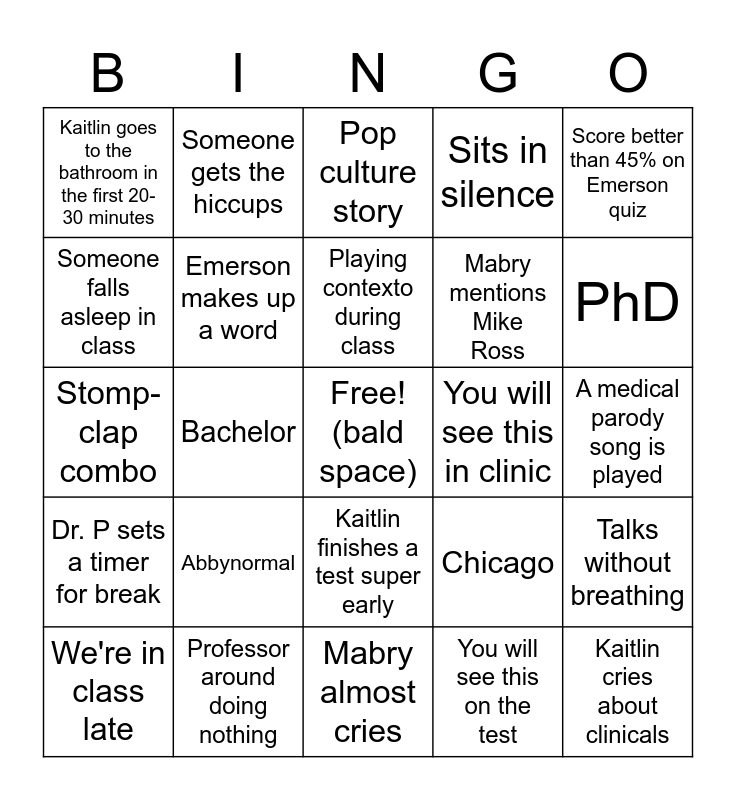 This bingo card has a free space and 24 words: Abbynormal, Professor around doing nothing, Playing contexto during class, We're in class late, Score better than 45% on Emerson quiz, Kaitlin goes to the bathroom in the first 20-30 minutes, Someone falls asleep in class, Someone gets the hiccups, You will see this in clinic, Kaitlin finishes a test super early, Mabry mentions Mike Ross, Stomp-clap combo, Chicago, Talks without breathing, Emerson makes up a word, You will see this on the test, A medical parody song is played, Pop culture story, PhD, Bachelor, Kaitlin cries about clinicals, Dr. P sets a timer for break, Sits in silence and Mabry almost cries.