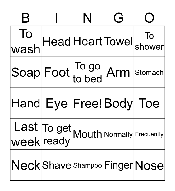 This bingo card has a free space and 24 words: To get ready, Shave, To go to bed, Neck, To shower, To wash, Soap, Head, Body, Mouth, Arm, Hand, Normally, Frecuently, Foot, Finger, Toe, Heart, Stomach, Eye, Nose, Last week, Towel and Shampoo.