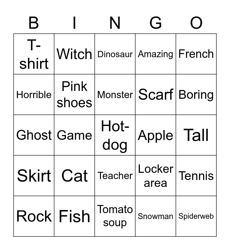 This bingo card has a free space and 24 words: Cat, Fish, Monster, Rock, French, T-shirt, Horrible, Witch, Apple, Teacher, Scarf, Ghost, Locker area, Tennis, Pink shoes, Snowman, Tall, Dinosaur, Boring, Game, Spiderweb, Skirt, Amazing and Tomato soup.