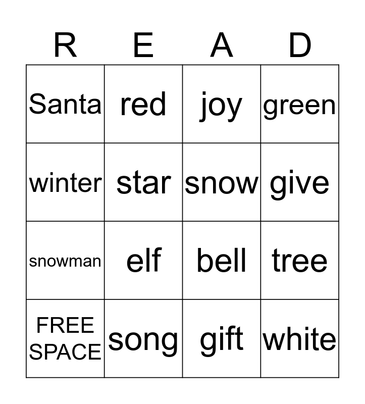 This bingo card has 16 words: song, tree, joy, Santa, snowman, red, bell, gift, winter, star, FREE SPACE, green, elf, give, snow and white.