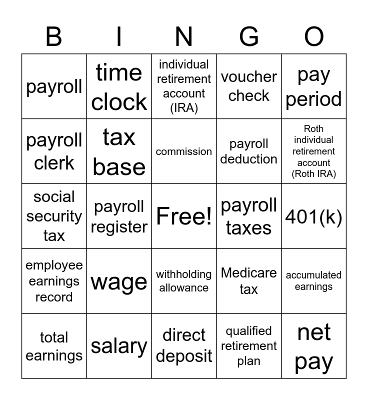 This bingo card has a free space and 24 words: wage, salary, commission, total earnings, pay period, payroll, payroll clerk, time clock, payroll taxes, withholding allowance, payroll deduction, social security tax, Medicare tax, accumulated earnings, tax base, qualified retirement plan, 401(k), individual retirement account (IRA), Roth individual retirement account (Roth IRA), payroll register, net pay, employee earnings record, voucher check and direct deposit.