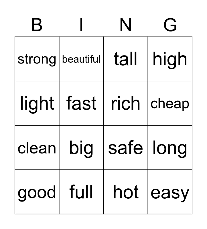 This bingo card has 16 words: full, long, tall, strong, clean, beautiful, safe, hot, light, fast, good, high, big, cheap, rich and easy.