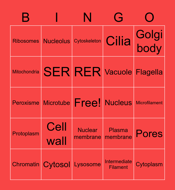 This bingo card has a free space and 24 words: Cell wall, Cytosol, RER, Chromatin, Golgi body, Ribosomes, Mitochondria, Nucleolus, Nucleus, Nuclear membrane, Vacuole, Peroxisme, Plasma membrane, Pores, SER, Intermediate Filament, Microfilament, Cytoskeleton, Flagella, Microtube, Cytoplasm, Protoplasm, Cilia and Lysosome.