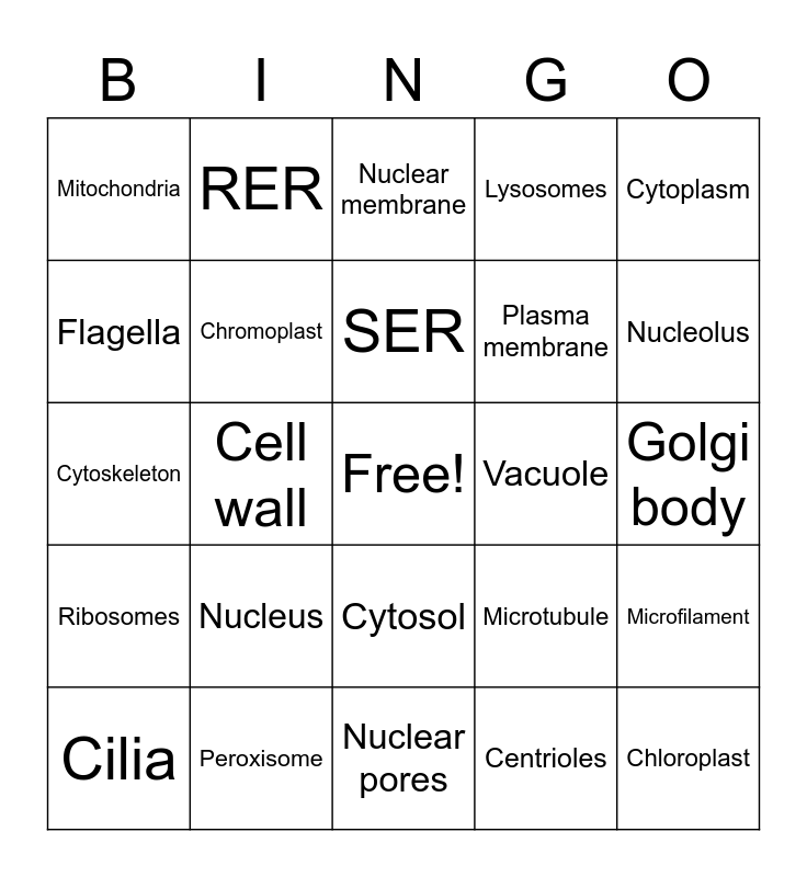 This bingo card has a free space and 24 words: Nucleus, Peroxisome, SER, Cilia, Cytoplasm, Mitochondria, Flagella, RER, Vacuole, Cytosol, Plasma membrane, Cytoskeleton, Microtubule, Microfilament, Chromoplast, Centrioles, Golgi body, Nuclear membrane, Nucleolus, Cell wall, Chloroplast, Ribosomes, Lysosomes and Nuclear pores.