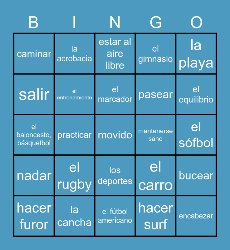 This bingo card has 43 words: Free!, movido, atlético, hacer furor, hacer ejercicio, hacer surf, estar al aire libre, ir, la playa, la cancha, el gimnasio, mantenerse sano, los deportes, el rugby, el fútbol, el fútbol americano, el balonmano, el baloncesto, básquetbol, el voleibol, el equilibrio, la acrobacia, el béisbol, la gimnasia artística, caminar, correr, el sófbol, patinar, los rollers, el carro, nadar, la animación, bucear, el ciclismo, practicar, jugar, el partido, encabezar, el marcador, salir, pasear, deportivo, el entrenamiento and la jardinería.