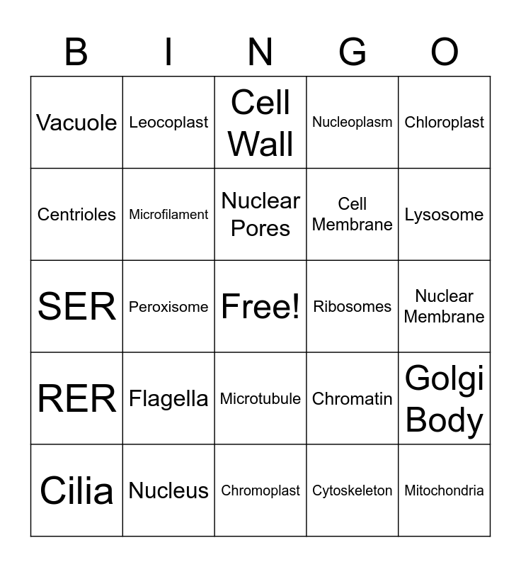 This bingo card has a free space and 24 words: Flagella, Nucleus, Nuclear Pores, Cilia, Chloroplast, Vacuole, Centrioles, Leocoplast, Ribosomes, Microtubule, Cell Membrane, SER, Chromatin, Golgi Body, Microfilament, Cytoskeleton, Nuclear Membrane, Cell Wall, Lysosome, Peroxisome, Mitochondria, RER, Nucleoplasm and Chromoplast.