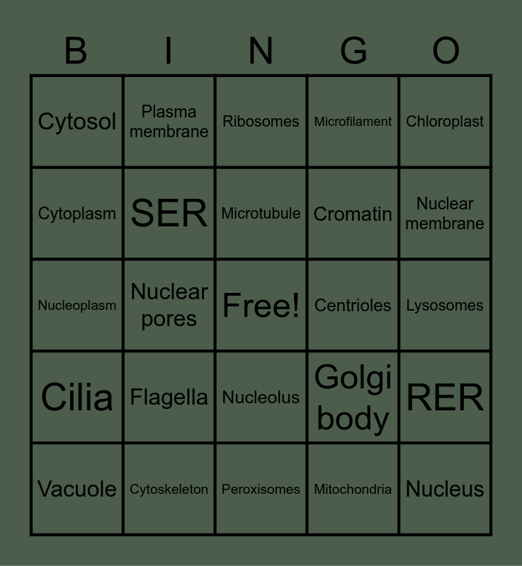 This bingo card has a free space and 24 words: Flagella, Cytoskeleton, Microtubule, Vacuole, Chloroplast, Cytosol, Cytoplasm, Plasma membrane, Centrioles, Nucleolus, Cromatin, Nucleoplasm, Golgi body, RER, SER, Mitochondria, Lysosomes, Ribosomes, Nuclear membrane, Nuclear pores, Nucleus, Cilia, Microfilament and Peroxisomes.