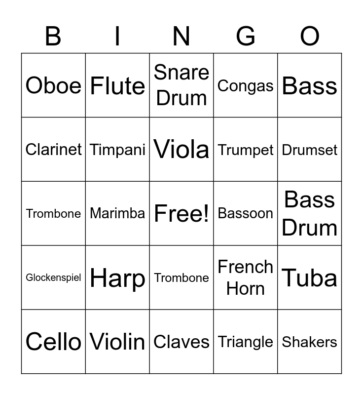 This bingo card has a free space and 24 words: Harp, Violin, Viola, Cello, Bass, Oboe, Clarinet, Flute, Bassoon, Trombone, Trumpet, Trombone, French Horn, Tuba, Timpani, Triangle, Bass Drum, Snare Drum, Drumset, Marimba, Shakers, Glockenspiel, Congas and Claves.