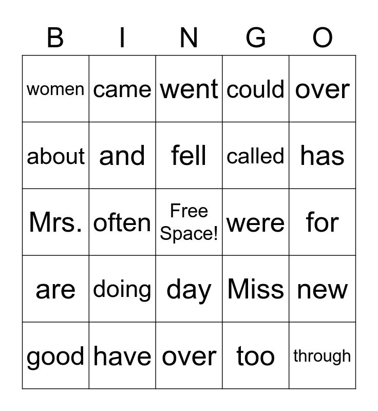 This bingo card has a free space and 29 words: good, my, often, one, women, went, and, doing, were, have, for, through, over, too, has, want, day, are, over, Mrs., Miss, Mr., called, about, could, came, new, fell and again.