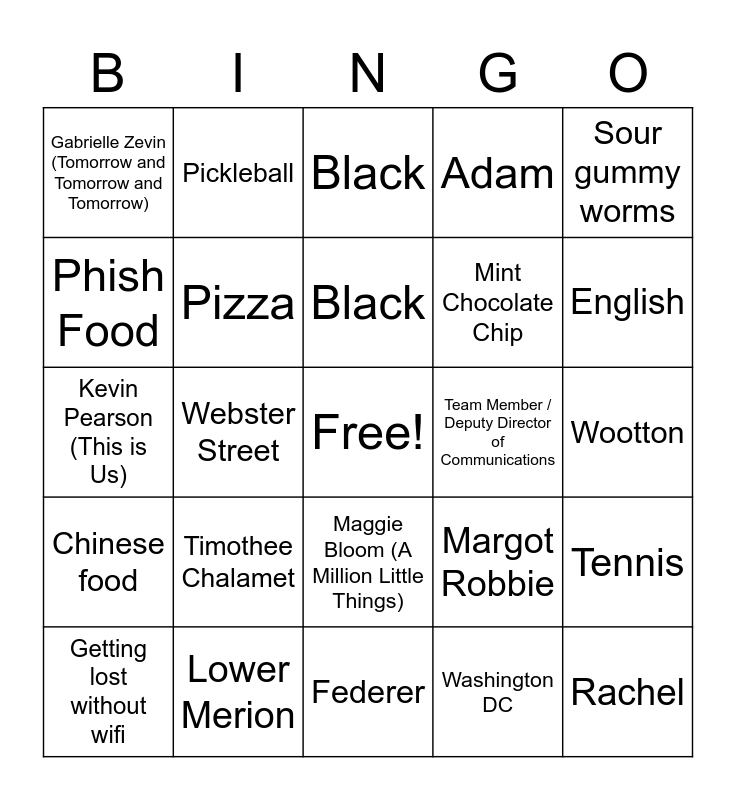 This bingo card has a free space and 32 words: Washington DC, Bryn Mawr, Pa, Webster Street, Captiva, Chinese food, Pizza, Sour gummy worms, Tennis, Pickleball, Soccer, Lacrosse, Poms, Black, Black, Samoa, Director of Customer Success, Team Member / Deputy Director of Communications, Lexi's undercooked hamburgers, Getting lost without wifi, Kevin Pearson (This is Us), Maggie Bloom (A Million Little Things), Timothee Chalamet, Margot Robbie, Ted Lasso, Wootton, Lower Merion, Rachel, Adam, Mint Chocolate Chip, Phish Food, Gabrielle Zevin (Tomorrow and Tomorrow and Tomorrow), Federer, Math and English.