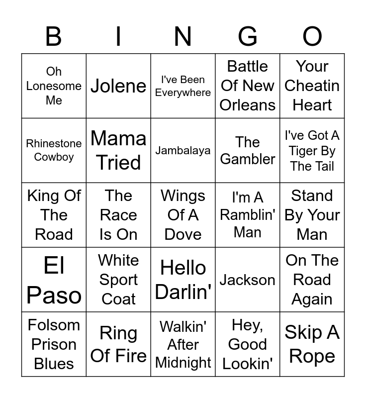 This bingo card has 25 words: White Sport Coat, Walkin' After Midnight, Jambalaya, Folsom Prison Blues, Your Cheatin Heart, Oh Lonesome Me, Rhinestone Cowboy, Jolene, I'm A Ramblin' Man, Hello Darlin', The Gambler, King Of The Road, Jackson, On The Road Again, Mama Tried, Skip A Rope, Stand By Your Man, I've Been Everywhere, I've Got A Tiger By The Tail, The Race Is On, Wings Of A Dove, Ring Of Fire, El Paso, Battle Of New Orleans and Hey, Good Lookin'.