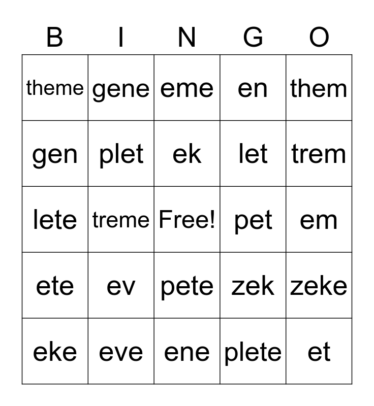 This bingo card has a free space and 24 words: ev, eve, ek, eke, them, theme, gen, gene, pet, pete, let, lete, zek, zeke, plet, plete, em, eme, trem, treme, et, ete, en and ene.