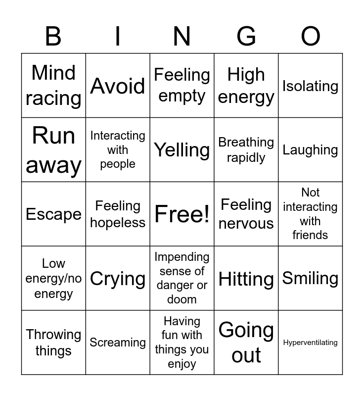 This bingo card has a free space and 24 words: Crying, Screaming, Yelling, Throwing things, Isolating, Mind racing, Run away, Avoid, Feeling nervous, Impending sense of danger or doom, Breathing rapidly, Escape, Hitting, Smiling, Interacting with people, Going out, Not interacting with friends, Feeling empty, Laughing, Feeling hopeless, Hyperventilating, Low energy/no energy, High energy and Having fun with things you enjoy.