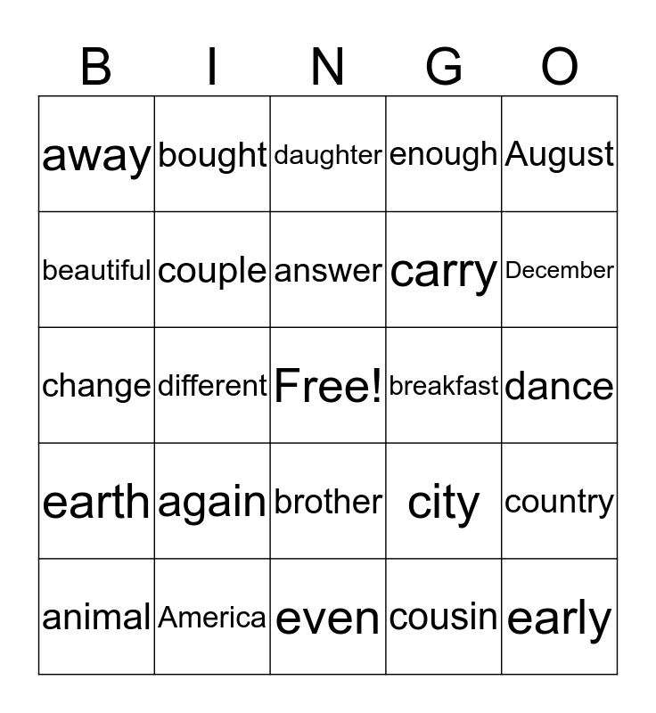 This bingo card has a free space and 24 words: again, America, answer, animal, August, away, beautiful, bought, breakfast, brother, carry, change, city, country, couple, cousin, dance, daughter, December, different, early, earth, enough and even.