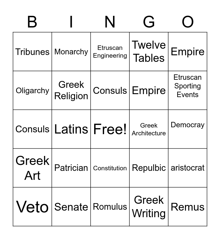 This bingo card has a free space and 24 words: Patrician, Senate, Consuls, Veto, Empire, Tribunes, Oligarchy, Monarchy, Greek Architecture, Constitution, Empire, Consuls, Repulbic, aristocrat, Greek Religion, Greek Writing, Democray, Etruscan Engineering, Etruscan Sporting Events, Latins, Remus, Greek Art, Twelve Tables and Romulus.