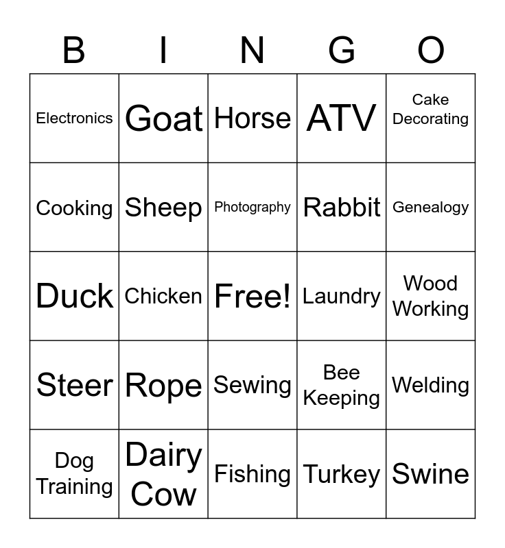 This bingo card has a free space and 30 words: Dairy Cow, Gardening, Chicken, Money Management, Electronics, Horse, Sheep, Sewing, Laundry, Fishing, Wood Working, Swine, Turkey, First Aid, Genealogy, Hunting, Bee Keeping, Steer, Rope, Cake Decorating, Duck, Llama, Goat, Rabbit, Cooking, ATV, Welding, Dog Training, Photography and Archery.
