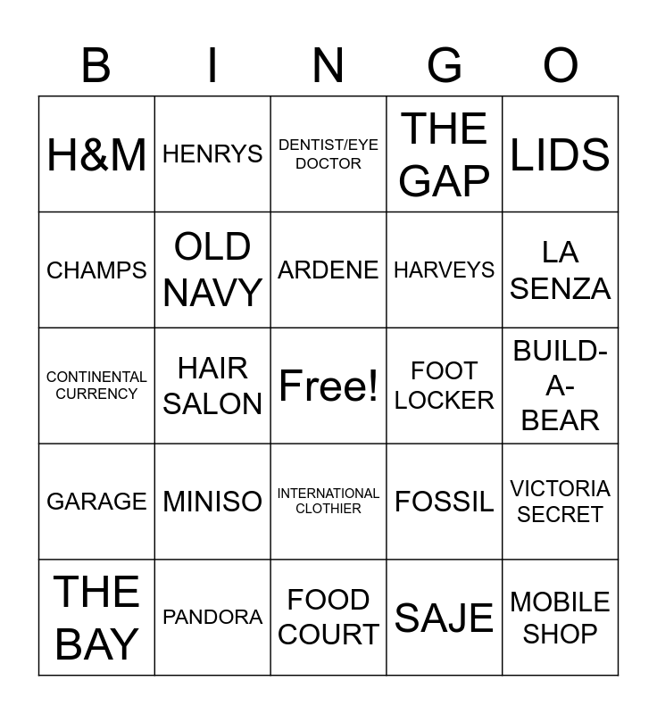 This bingo card has a free space and 56 words: SEPHORA, THE BAY, JD SPORTS, H&M, FOOD COURT, PEOPLE'S, OLD NAVY, TORRID, HARVEYS, SHOWCASE, THE GAP, HALLMARK, URBAN PLANET, LUSH, ARITIZIA, KFC/TACO BELL, LIDS, HAIR SALON, CLAIRES, MOBILE SHOP, FOOT LOCKER, JUMP+, FOSSIL, DENTIST/EYE DOCTOR, COMIC STORE, ARDENE, COLES, HOT TOPIC, LA SENZA, AERIE, ASHLEY JEWELLERS, BATH & BODY, BIKINI VILLAGE, BANK, BUILD-A-BEAR, CHAMPS, CONTINENTAL CURRENCY, GAME STOP, GARAGE, HENRYS, INTERNATIONAL CLOTHIER, SPORT CHEK, JOURNEYS, MAC, DAVID'S TEA, MINISO, PANDORA, REITMANS, ROOTS, RICKIS, SAJE, SHOPPERS, SHOE STORES, THE BODY SHOP, VICTORIA SECRET and URBAN BEHAVIOUR.