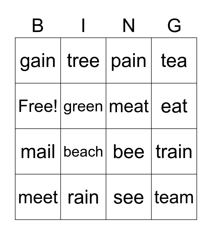 This bingo card has 16 words: rain, train, pain, gain, mail, tree, bee, see, Free!, green, meet, tea, beach, eat, meat and team.