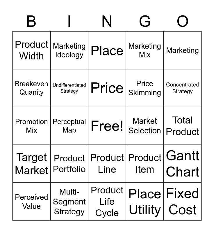 This bingo card has a free space and 34 words: Time Utility, Place Utility, Market Segment, Market Segmentation, Target Market, Undifferentiated Strategy, Marketing, Perceived Value, Marketing Ideology, Product, Price, Place, Promotion, Distribution Channels, Market Selection, Concentrated Strategy, Multi-Segment Strategy, Promotion Mix, Product Portfolio, Product Item, Product Line, Product Depth, Product Width, Total Product, Product Life Cycle, Fixed Cost, Marketing Mix, Penetration Pricing, Price Skimming, Breakeven Quanity, Product Development Process, Perceptual Map, Gantt Chart and Pert Diagram.