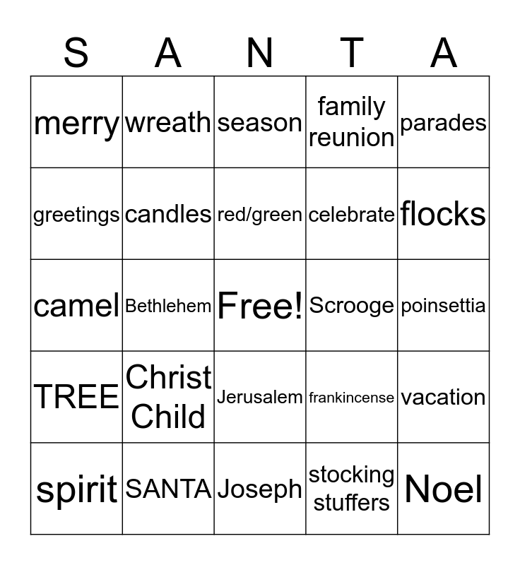 This bingo card has a free space and 62 words: CHRISTMAS, SANTA, REINDEER, TREE, LIGHTS, bells, candles, cards, celebrate, festival, family reunion, Frosty, greetings, holiday, jubilee, merry, Noel, parades, party, red/green, Scrooge, season, spirit, stocking stuffers, stockings, traditions, traffic, trips, vacation, yuletide, eggnog, fruitcake, holly, mistletoe, poinsettia, wreath, angels, JESUS, Bethlehem, birth, camel, ceremonies, Christ Child, donkey, flocks, frankincense, gifts, gold, holy, inn, Jerusalem, Joseph, manager, Mary, miracle, nativity, Savior, shepherds, stable, star, wisemen and worship.
