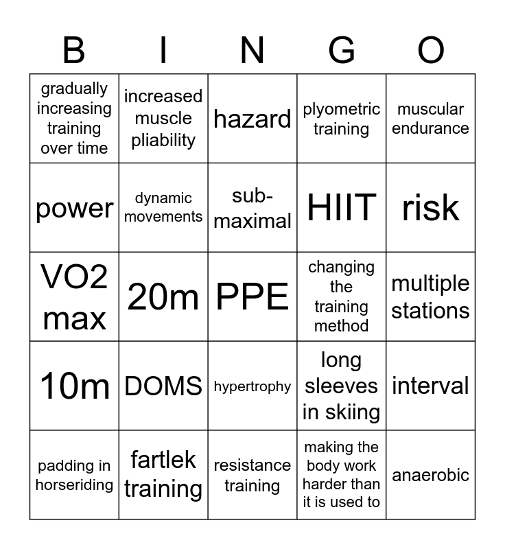This bingo card has 35 words: Lactic Acid, Playing field, Mobility, dynamic movements, hypertrophy, plyometric training, power, balance, sub-maximal, validity, VO2 max, muscular endurance, specificity, frequency, gradually increasing training over time, changing the training method, making the body work harder than it is used to, 20m, 10m, PPE, long sleeves in skiing, padding in horseriding, interval, fartlek training, hazard, risk, anaerobic, aerobic, HIIT, multiple stations, steady state, resistance training, DOMS, increased muscle pliability and intensity.