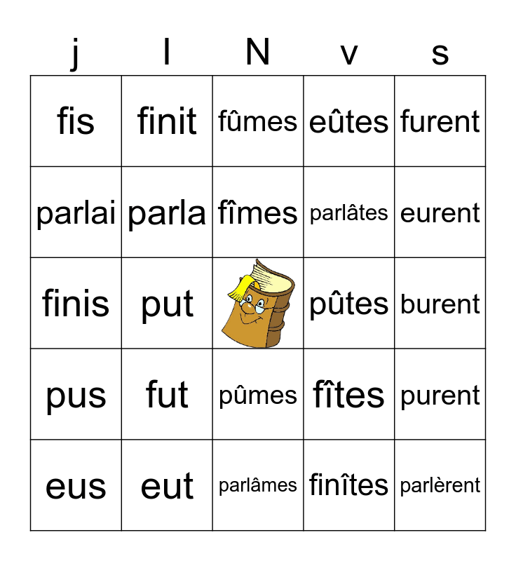 This bingo card has a free space and 34 words: bus, but, bûmes, bûtes, burent, parlai, parla, parlâmes, parlâtes, parlèrent, finis, finit, finîtes, finirent, pus, put, pûmes, pûtes, purent, eus, eut, eûmes, eûtes, eurent, fus, fut, fûmes, fûtes, furent, fis, fit, fîmes, fîtes and firent.