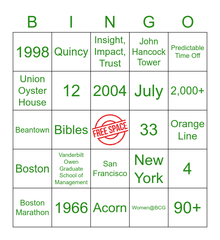 This bingo card has a free space and 24 words: Vanderbilt Owen Graduate School of Management, 1966, 2004, Boston Marathon, Predictable Time Off, 1998, Union Oyster House, Quincy, 33, San Francisco, July, Beantown, New York, 4, 12, Women@BCG, Orange Line, Insight, Impact, Trust, 2,000+, Bibles, 90+, Boston, John Hancock Tower and Acorn.