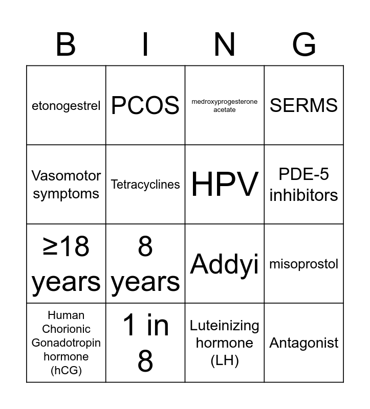 This bingo card has 30 words: leuprolide acetate, mifepristone, misoprostol, levonorgestrel, etonogestrel, medroxyprogesterone acetate, HPV, 1 in 5, 1 in 8, 11 years, Luteinizing hormone (LH), Human Chorionic Gonadotropin hormone (hCG), Vas Deferens, Trichomoniasis vaginalis, 8 years, Gender Dysphoria, 60 years, Antagonist, Vasopressin, Vasomotor symptoms, Addyi, Low ionization, PCOS, ≥18 years, Tetracyclines, SERMS, NSAIDs, Copper, PDE-5 inhibitors and Women’s Health Initiative.