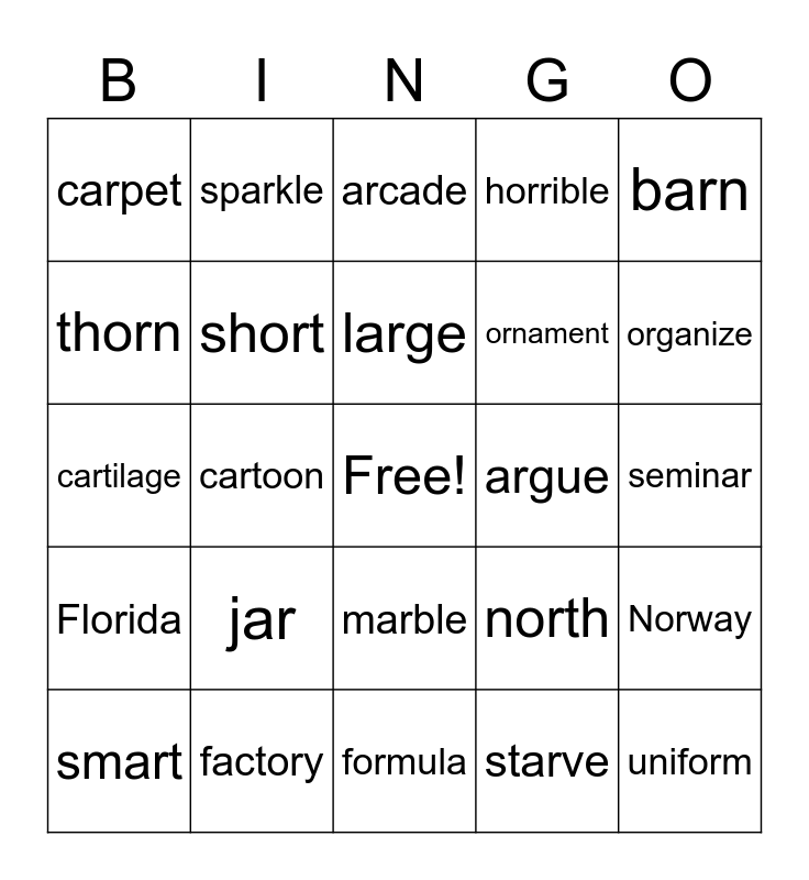 This bingo card has a free space and 24 words: smart, jar, large, starve, barn, carpet, sparkle, arcade, argue, seminar, cartilage, short, north, Norway, thorn, factory, formula, horrible, organize, Florida, cartoon, marble, ornament and uniform.