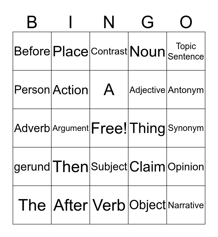 This bingo card has a free space and 24 words: Then, After, A, The, Topic Sentence, Before, Person, Place, Thing, Subject, Adjective, Adverb, Claim, Opinion, Action, Object, Synonym, Contrast, Antonym, Argument, Narrative, gerund, Noun and Verb.