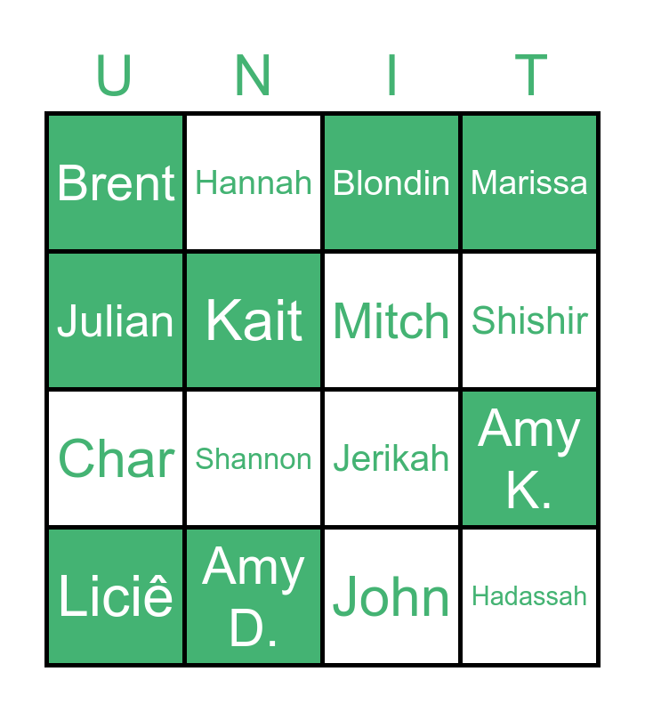 This bingo card has 16 words: Amy D., Amy K., Blondin, Brent, Char, Hannah, Jerikah, John, Julian, Kait, Liciê, Marissa, Shannon, Shishir, Mitch and Hadassah.