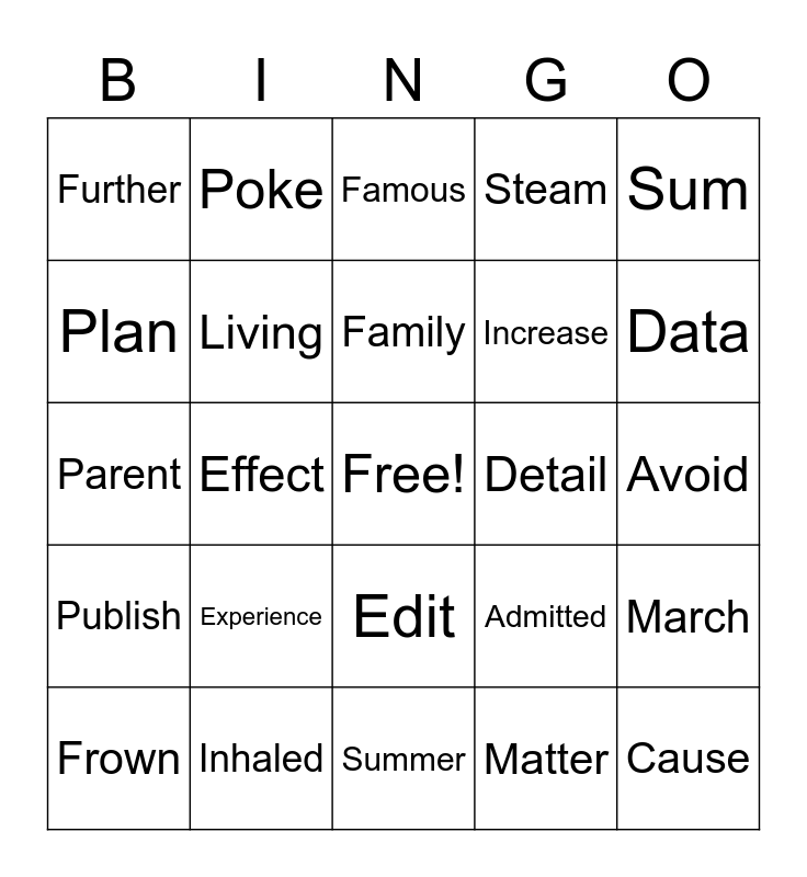 This bingo card has a free space and 24 words: Experience, Inhaled, Family, Frown, Sum, Further, Plan, Poke, Detail, Edit, Increase, Parent, Admitted, March, Living, Matter, Avoid, Famous, Data, Effect, Cause, Publish, Steam and Summer.