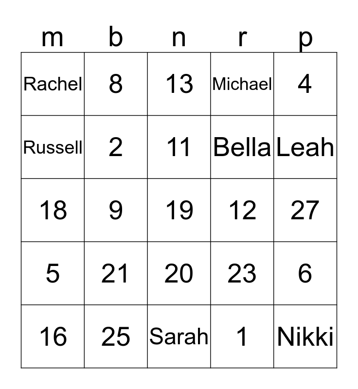 This bingo card has a free space and 32 words: 1, 3, 9, 7, 5, 2, 4, 6, 8, 10, 11, 13, 17, 15, 12, 14, 16, 18, 20, 21, 23, 29, 27, 25, Nikki, Michael, Bella, Russell, Rachel, Sarah, Darren and Leah.