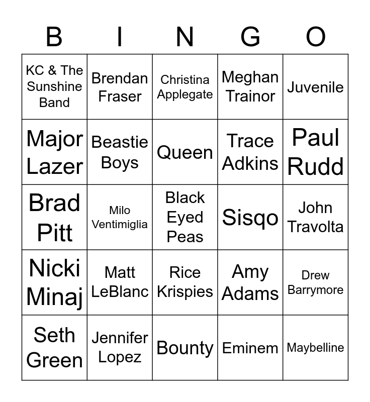 This bingo card has 60 words: Destiny’s Child, Jennifer Lopez, T-Pain, Nicki Minaj, Eminem, Ying Yang Twins, Beastie Boys, Ghostface Killah, Trace Adkins, Trina, Meghan Trainor, Flo Rida, Major Lazer, Pitbull, LL Cool J, KC & The Sunshine Band, Black Eyed Peas, Juvenile, A Tribe Called Quest, Queen, Sisqo, Christina Applegate, Seth Green, Drew Barrymore, Ben Affleck, Mila Kunis, Tina Fey, Mark Ruffalo, Paul Rudd, Bryan Cranston, Aaron Paul, Stanely Tucci, Elizabeth Moss, Keanu Reeves, Brendan Fraser, Elijah Wood, Kristen Stewart, Milo Ventimiglia, Leonardo DiCaprio, Brad Pitt, Anne Hathaway, Matt LeBlanc, John Travolta, Steve Carrell, Amy Adams, Joseph Gordon Levitt, Nike, Capital One, Staples, Rice Krispies, Bounty, Kentucky Fried Chicken, Verizon, Wheaties, Lay’s, Taco Bell, Doublemint Gum, Burger King, Maybelline and Skittles.