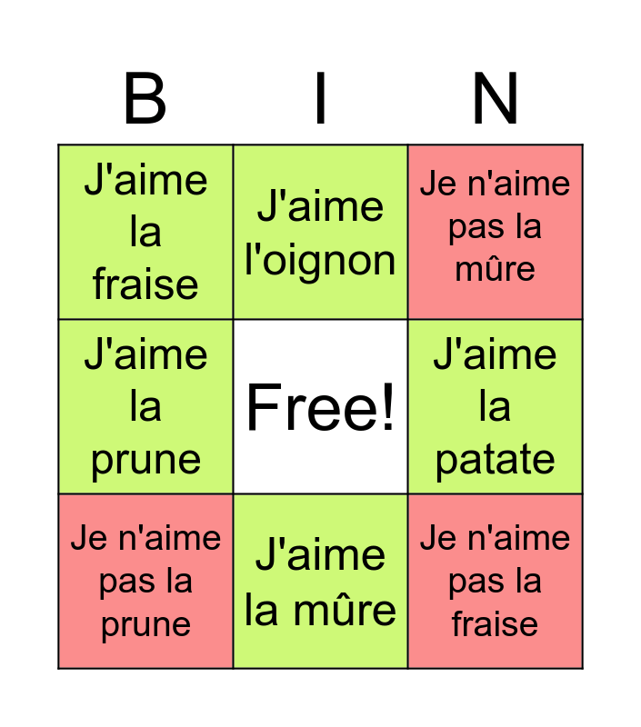 This bingo card has a free space and 10 words: J'aime la mûre, Je n'aime pas la mûre, J'aime la fraise, Je n'aime pas la fraise, J'aime la prune, Je n'aime pas la prune, J'aime l'oignon, Je n'aime pas l'oignon, J'aime la patate and Je n'aime pas la patate.