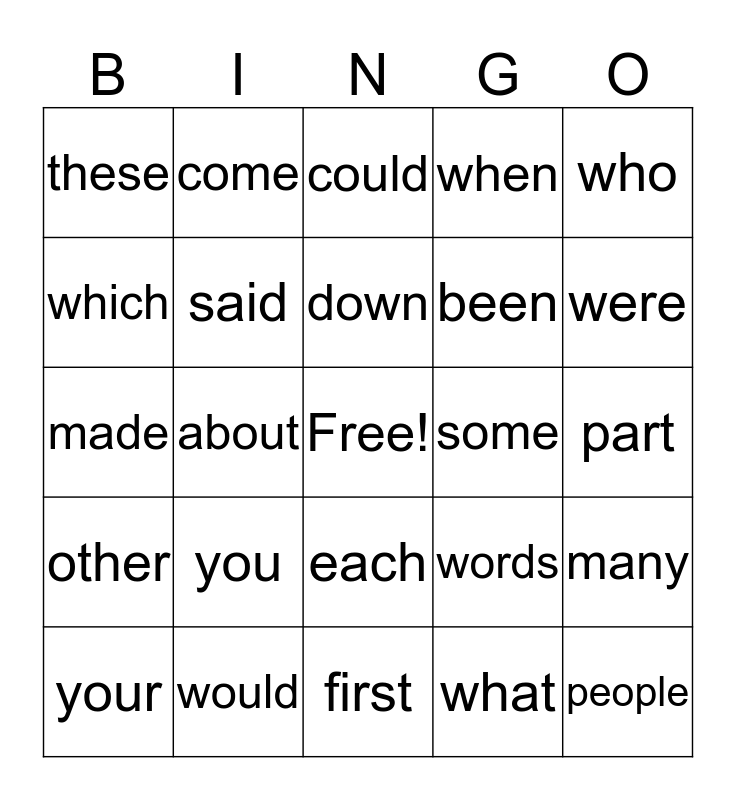 This bingo card has a free space and 24 words: you, would, down, your, who, these, which, come, some, each, been, made, words, many, said, what, part, could, were, about, people, other, when and first.