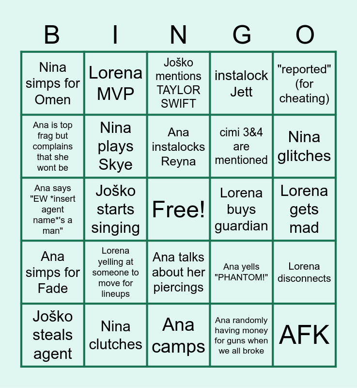 This bingo card has a free space and 24 words: Lorena yelling at someone to move for lineups, Nina clutches, Ana instalocks Reyna, Joško steals agent, "reported" (for cheating), Nina simps for Omen, Ana is top frag but complains that she wont be, Lorena MVP, Lorena buys guardian, Ana talks about her piercings, cimi 3&4 are mentioned, Ana says "EW *insert agent name*'s a man", Ana yells "PHANTOM!", Lorena disconnects, Nina plays Skye, Ana randomly having money for guns when we all broke, Lorena gets mad, Joško mentions TAYLOR SWIFT, Nina glitches, Joško starts singing, AFK, Ana simps for Fade, instalock Jett and Ana camps.