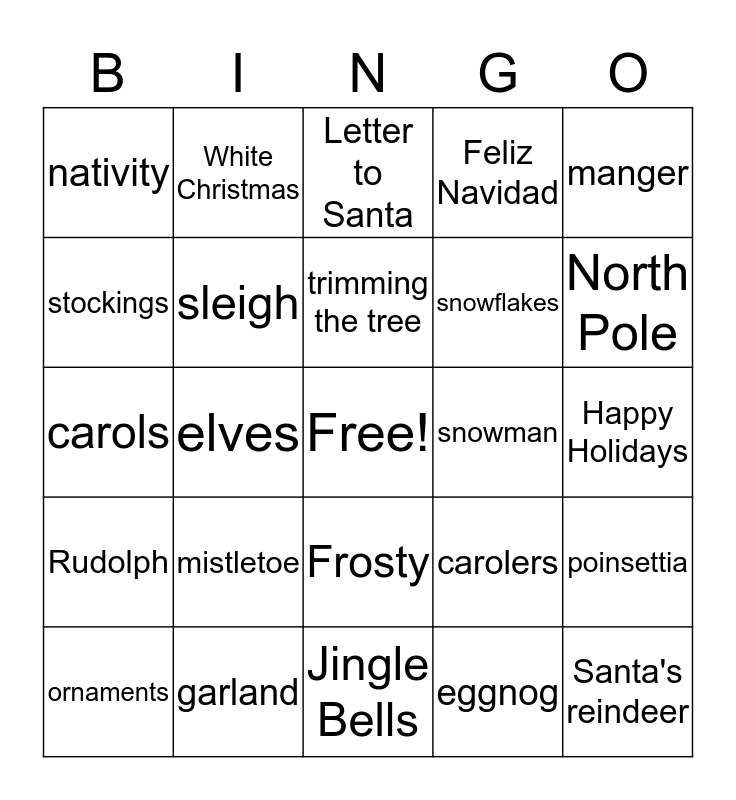 This bingo card has a free space and 24 words: mistletoe, garland, trimming the tree, ornaments, manger, nativity, stockings, White Christmas, snowman, Frosty, snowflakes, carols, carolers, poinsettia, sleigh, eggnog, Happy Holidays, Letter to Santa, North Pole, elves, Santa's reindeer, Rudolph, Feliz Navidad and Jingle Bells.