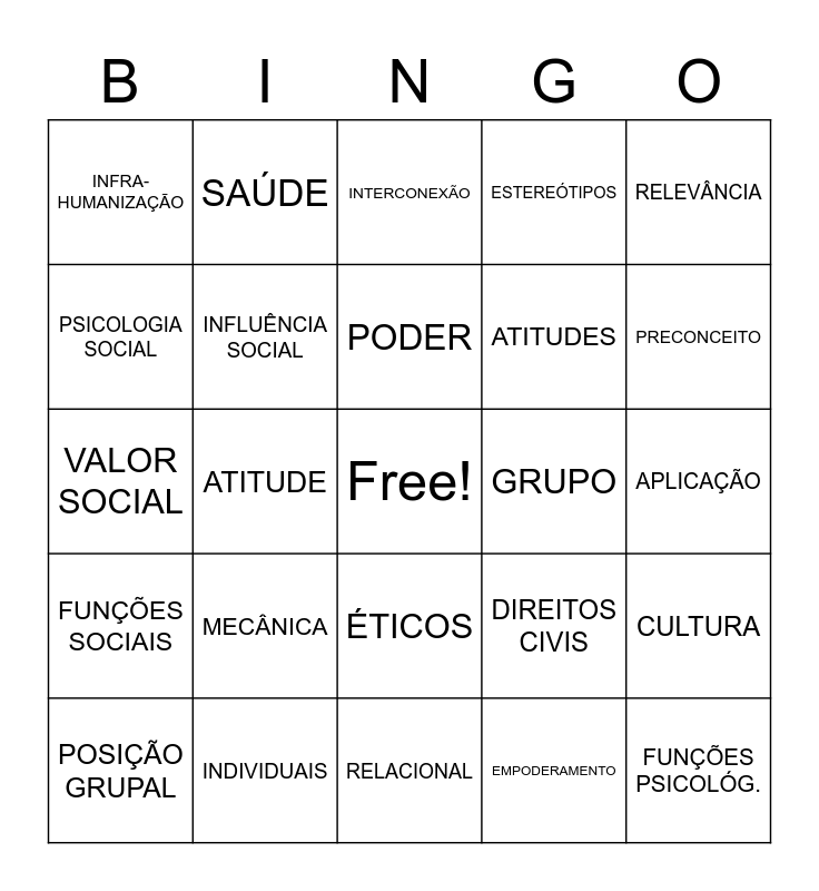 This bingo card has a free space and 38 words: INDIVÍ́DUO-SOCIEDADE, ALLPORT, ZAJONC, INFLUÊNCIA SOCIAL, CULTURA, MECÂNICA, PODER, TRANSMITIDO, RELEVÂNCIA, ATITUDES, ATITUDE, ESTEREÓTIPOS, FUNÇÕES PSICOLÓG., APLICAÇÃO, PSICOLOGIA SOCIAL, FUNÇÕES SOCIAIS, EMOÇÃO, INTERCONEXÃO, RELAÇÃO, GRUPO, INFRA-HUMANIZAÇÃO, INDIVIDUAIS, PRECONCEITO, POSIÇÃO GRUPAL, INDIVIDUAL E GRUPAL, RELACIONAL, CONTEXTUAL, OBJETIVO, SUBJETIVO, PSICOLOGIA, RESPONSABILIDADE, ÉTICOS, EMPODERAMENTO, SAÚDE, DIREITOS HUMANOS, DIREITOS CIVIS, VALOR SOCIAL and IDEOLÓGICA.