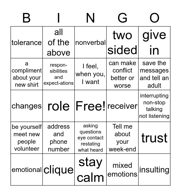 This bingo card has a free space and 24 words: address and phone number, clique, I feel, when you, I want, emotional, give in, tolerance, a compliment about your new shirt, all of the above, receiver, asking questions eye contact restating what heard, can make conflict better or worse, changes, Tell me about your week-end, trust, respon-sibilities and expect-ations, mixed emotions, interrupting non-stop talking not listening, nonverbal, save the messages and tell an adult, role, insulting, be yourself meet new people volunteer, two sided and stay calm.
