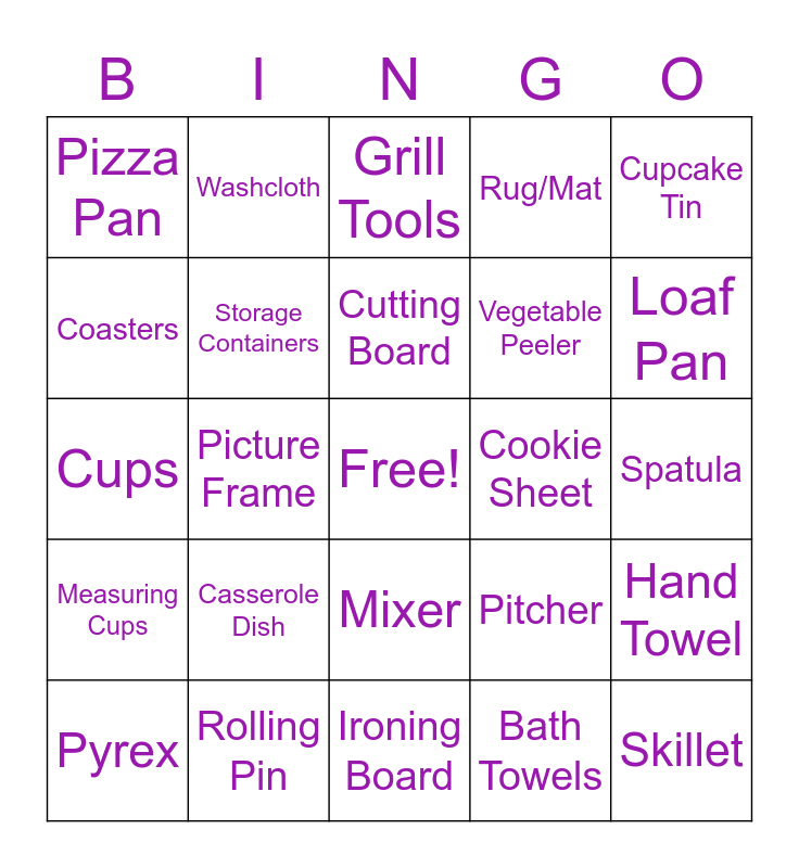 This bingo card has a free space and 32 words: Bath Towels, Kitchen Towels, Picture Frame, Wall Decor, Measuring Cups, Storage Containers, Cupcake Tin, Hand Towel, Washcloth, Mixing Bowls, Cutting Board, Grill Tools, Whisk, Blanket, Cookie Sheet, Oven Mitts, Pyrex, Cups, Mixer, Casserole Dish, Pitcher, Flatware, Spatula, Rolling Pin, Skillet, Rug/Mat, Vegetable Peeler, Coasters, Pizza Pan, Ironing Board, Cake Pan and Loaf Pan.