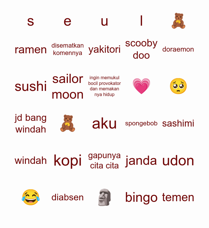 This bingo card has a free space and 24 words: kopi, diabsen, ingin memukul bocil provokator dan memakan nya hidup, 😂, doraemon, ramen, sushi, disematkan komennya, spongebob, gapunya cita cita, 💗, jd bang windah, janda, udon, sailor moon, bingo, sashimi, yakitori, 🥺, 🧸, temen, windah, scooby doo and 🗿.
