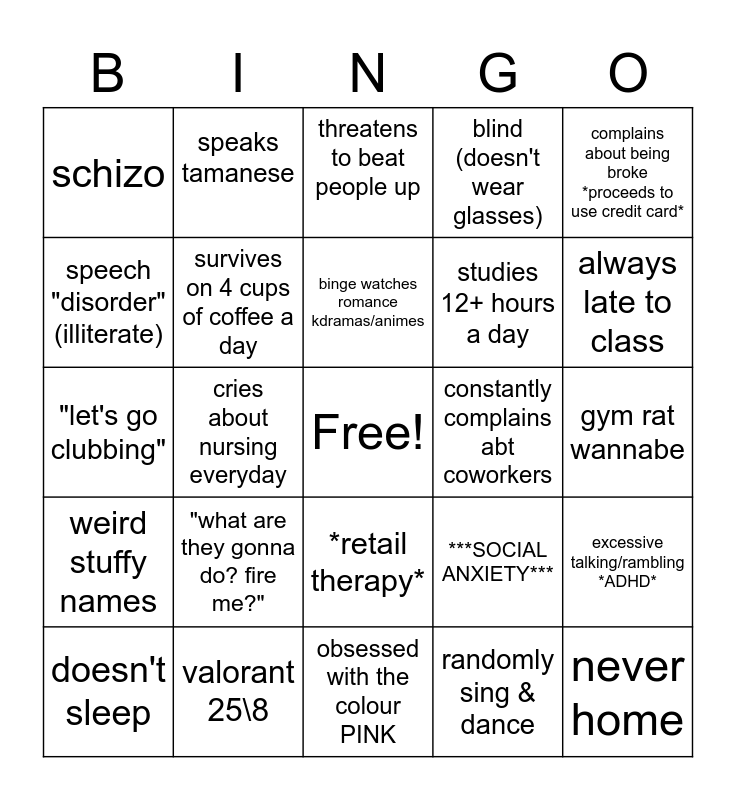 This bingo card has a free space and 24 words: "what are they gonna do? fire me?", valorant 25\8, binge watches romance kdramas/animes, doesn't sleep, complains about being broke *proceeds to use credit card*, schizo, speech "disorder" (illiterate), speaks tamanese, constantly complains abt coworkers, *retail therapy*, studies 12+ hours a day, "let's go clubbing", ***SOCIAL ANXIETY***, excessive talking/rambling *ADHD*, survives on 4 cups of coffee a day, randomly sing & dance, gym rat wannabe, threatens to beat people up, always late to class, cries about nursing everyday, never home, weird stuffy names, blind (doesn't wear glasses) and obsessed with the colour PINK.