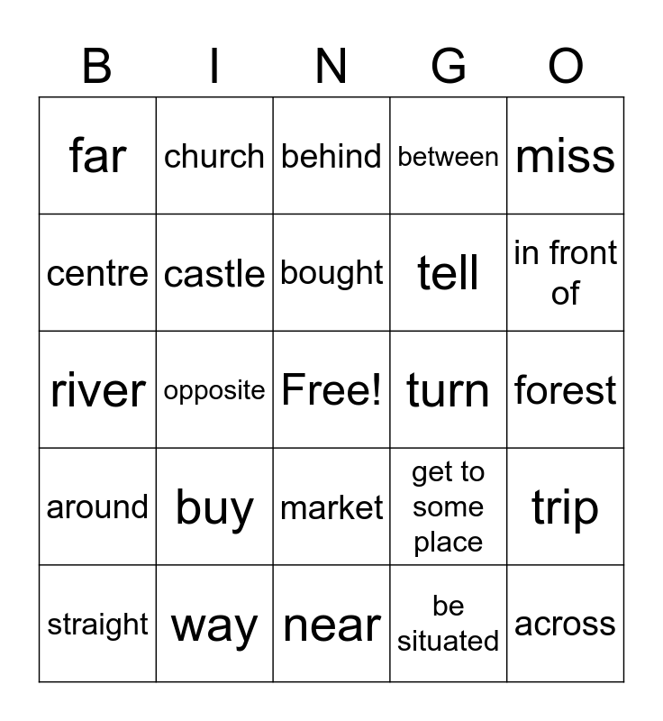 This bingo card has a free space and 24 words: buy, way, bought, straight, miss, far, centre, church, turn, market, tell, river, get to some place, trip, castle, be situated, forest, behind, in front of, opposite, across, around, between and near.