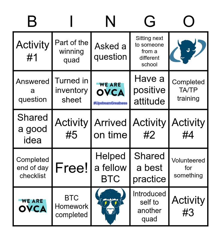 This bingo card has 4 images and 22 words: Free!, #UpstreamGreatness, Activity #1, Answered a question, Part of the winning quad, Activity #2, Helped a fellow BTC, Have a positive attitude, Shared a good idea, Shared a best practice, Volunteered for something, Turned in inventory sheet, Activity #3, Activity #4, Asked a question, Completed TA/TP training, Activity #5, Arrived on time, BTC Homework completed, Completed end of day checklist, Sitting next to someone from a different school and Introduced self to another quad.