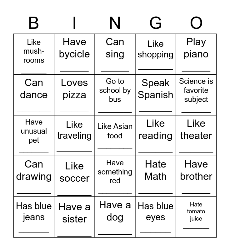This bingo card has a free space and 24 words: Like soccer ______, Have a sister ______, Go to school by bus ________, Has blue jeans ______, Play piano _____, Like mush- rooms ______, Can dance ______, Have bycicle _____, Like reading ______, Have something red ________, Speak Spanish ______, Have unusual pet _______, Hate Math ______, Have brother _____, Loves pizza _____, Has blue eyes ______, Like theater ______, Can sing _____, Science is favorite subject _______, Like traveling _______, Hate tomato juice ________, Can drawing ______, Like shopping _______ and Have a dog ______.