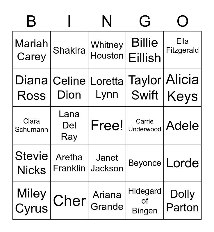 This bingo card has a free space and 26 words: Janet Jackson, Hidegard of Bingen, Loretta Lynn, Cher, Ella Fitzgerald, Mariah Carey, Diana Ross, Shakira, Adele, Beyonce, Taylor Swift, Clara Schumann, Lorde, Miley Cyrus, Lana Del Ray, Lizzo, Billie Eillish, Stevie Nicks, Whitney Houston, Dolly Parton, Alicia Keys, Ariana Grande, Carrie Underwood, Aretha Franklin, Celine Dion and Diana Ross.