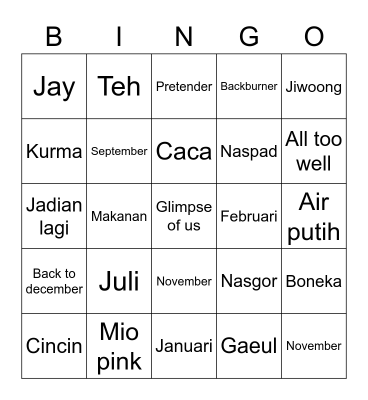 This bingo card has 26 words: November, Gaeul, Caca, Mio pink, Jiwoong, Jay, Kurma, Teh, Air putih, Nasgor, Naspad, Jadian lagi, Boneka, Cincin, Makanan, Playlist, Backburner, Back to december, Pretender, Glimpse of us, All too well, Januari, Februari, Juli, September and November.